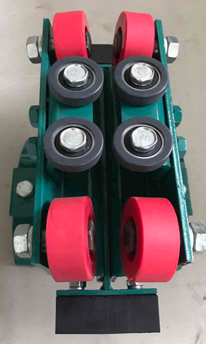 滑車由牽收引滑車、電纜滑車、終端滑車三部分組成,牽引滑車跟隨移動(dòng)機(jī)械導(dǎo)纜(牽引)裝置,每個(gè)移動(dòng)機(jī)械配1個(gè),隨移動(dòng)機(jī)械往返運(yùn)行。中間電纜滑車將電纜懸掛在工字鋼軌道范圍內(nèi)隨牽引滑車移動(dòng),兩端并裝有緩沖撞頭,滑車視移動(dòng)長度不同而定數(shù)量。終端滑車固定在工字鋼導(dǎo)軌末端,一般每個(gè)移動(dòng)機(jī)械設(shè)置1個(gè)。