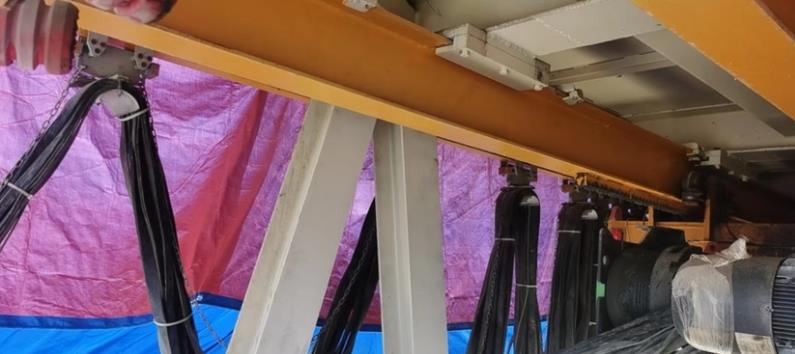 4、調(diào)整牽引鋼絲繩,工字鋼滑車使其長(zhǎng)度小于同節(jié)電纜長(zhǎng)度,運(yùn)行時(shí)由牽引鋼絲繩受力。