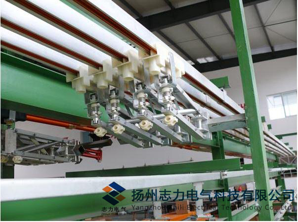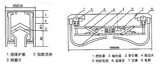 單極組合式滑觸線導電器:為接簧支撐式,僅在滑觸線下部即可推入,但須在牽引器同步進行,并保證拉簧力量適當,以免加大電刷磨損。牽引器與導電器同步進行,可用螺栓或電焊方式固定在行車等移動電器上,并適當保證導電器運行不受扭力。