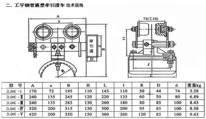 ZLGHC型工字鋼電纜滑車系列分為中載荷型、重載荷型和輕載荷型,因此滑車行走輪為Φ80、Φ63、Φ50的三種。承載能力<50~150kg,每類按托板層數(shù)分為單層、雙層、三層,每類中有三種形式。首端為電纜牽引車,終端為固定掛線架,中間為電纜滑車,該系列滑車分Ⅰ、Ⅱ、Ⅲ、Ⅳ、Ⅴ五種型號,如用戶采用12#、14#、16#或更大號數(shù)工字鋼,可在訂貨時注明,本公司可成套供貨。