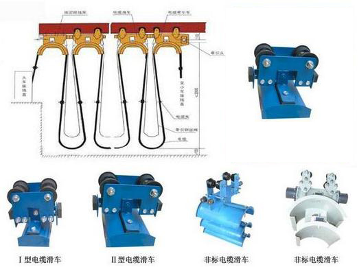 ZLGHC型工字鋼電纜滑車系列為起重機小車供電的一種導(dǎo)電形式。它有走輪、支架、托板組成,將軟電纜固定在托板上,由牽引架與電纜滑車同步,從而實現(xiàn)小車供電的目的。